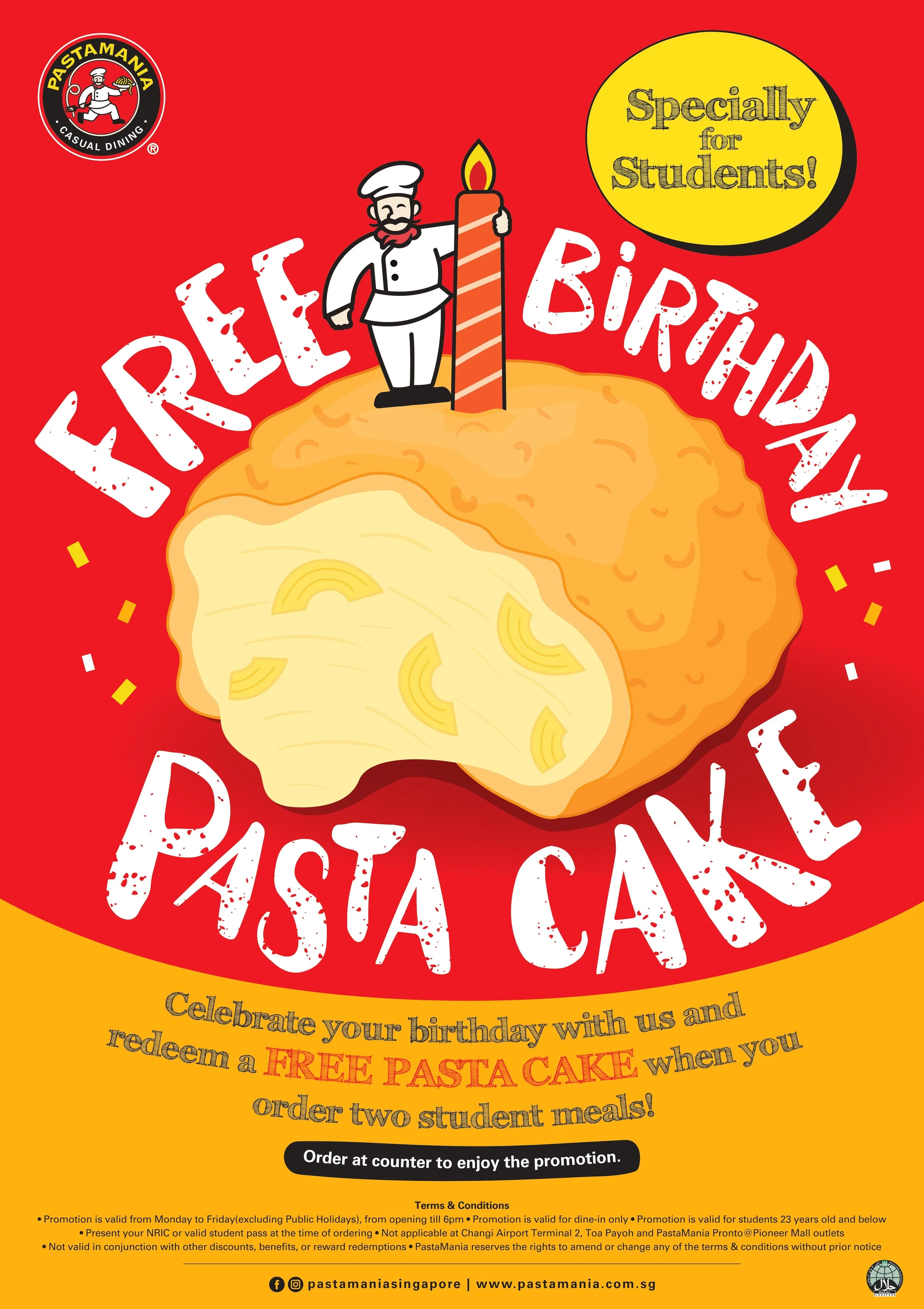 - Students can redeem a free pasta cake on their birthday month by ordering two student meals